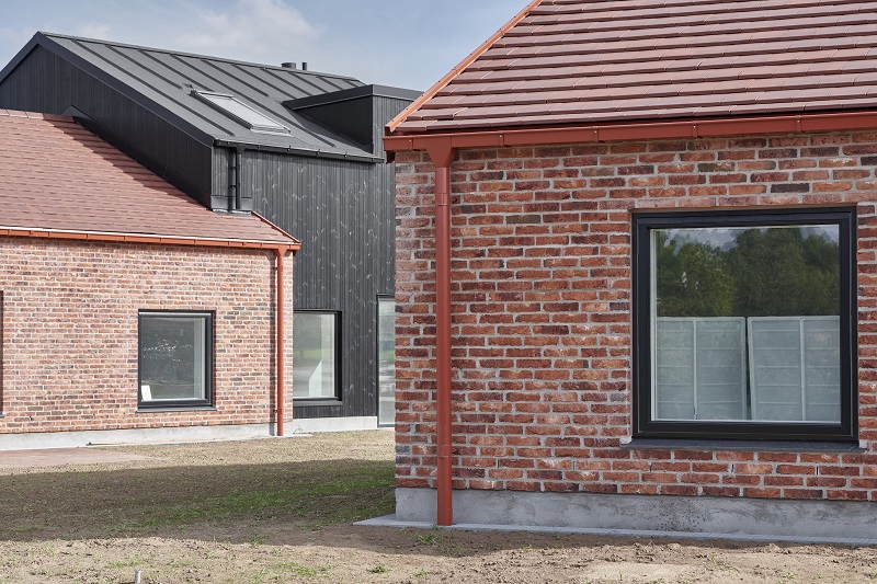 Das Projekt arbeitet bewusst mit Farbgestaltung und Form – und deshalb wurde die rechteckige Dachrinnenserie Lindab Rainline (RTRA) gewählt. Es war der einzige Anbieter, der Dachflächen, Dachrinnen und Halterungen in exakt derselben Farbe liefern konnte, was entscheidend war, um den gewünschten klaren, grafischen Ausdruck zu schaffen. Hier wurden die Farben Schwarz 015 und Ziegelrot 742 gewählt.