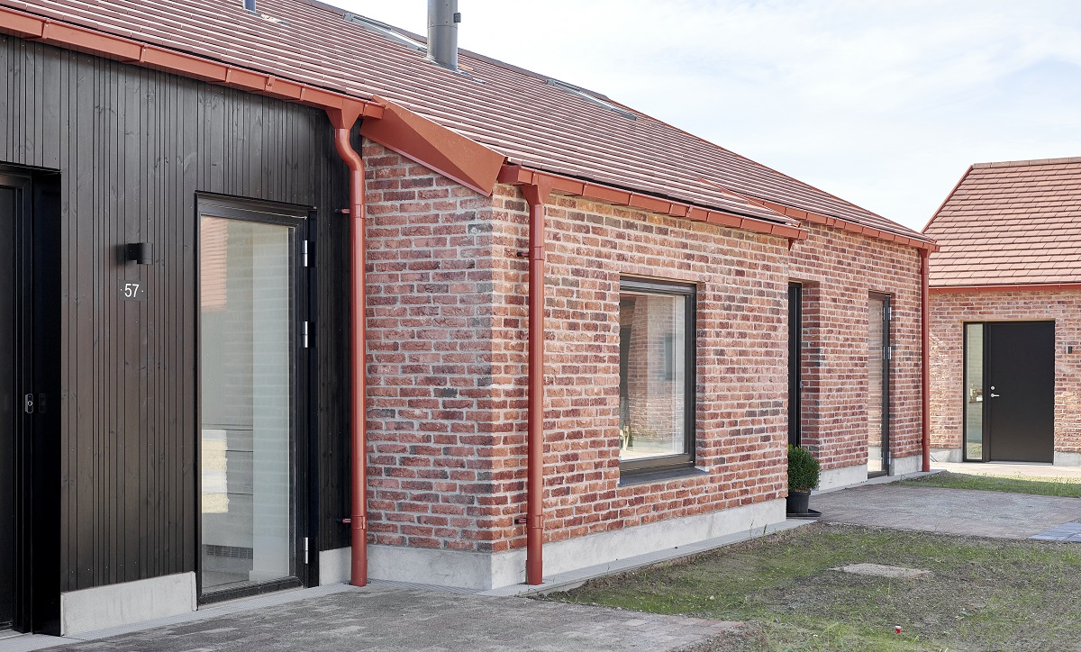 Das Projekt arbeitet bewusst mit Farbgestaltung und Form – und deshalb wurde die rechteckige Dachrinnenserie Lindab Rainline (RTRA) gewählt. Es war der einzige Anbieter, der Dachflächen, Dachrinnen und Halterungen in exakt derselben Farbe liefern konnte, was entscheidend war, um den gewünschten klaren, grafischen Ausdruck zu schaffen. Hier wurden die Farben Schwarz 015 und Ziegelrot 742 gewählt.